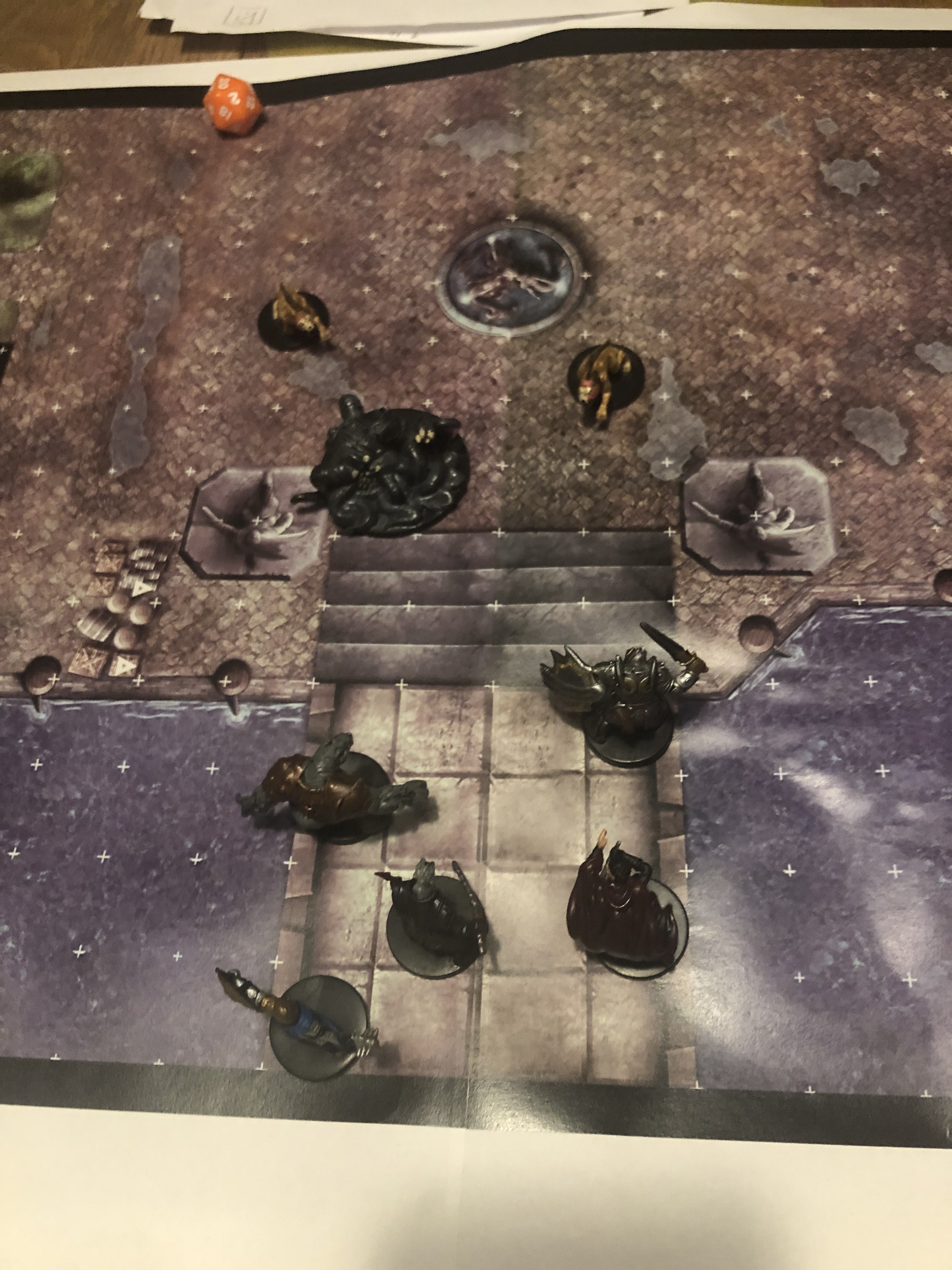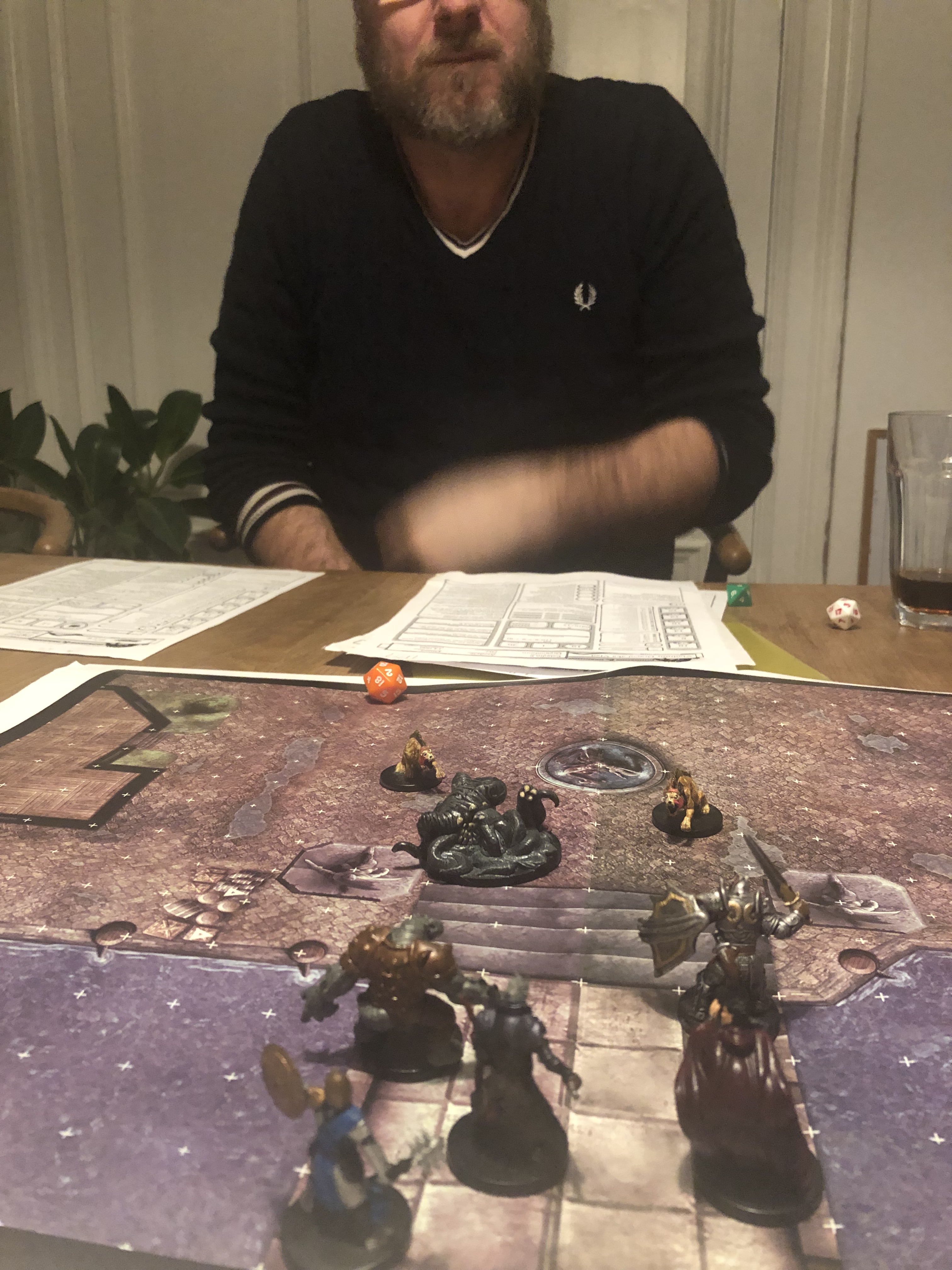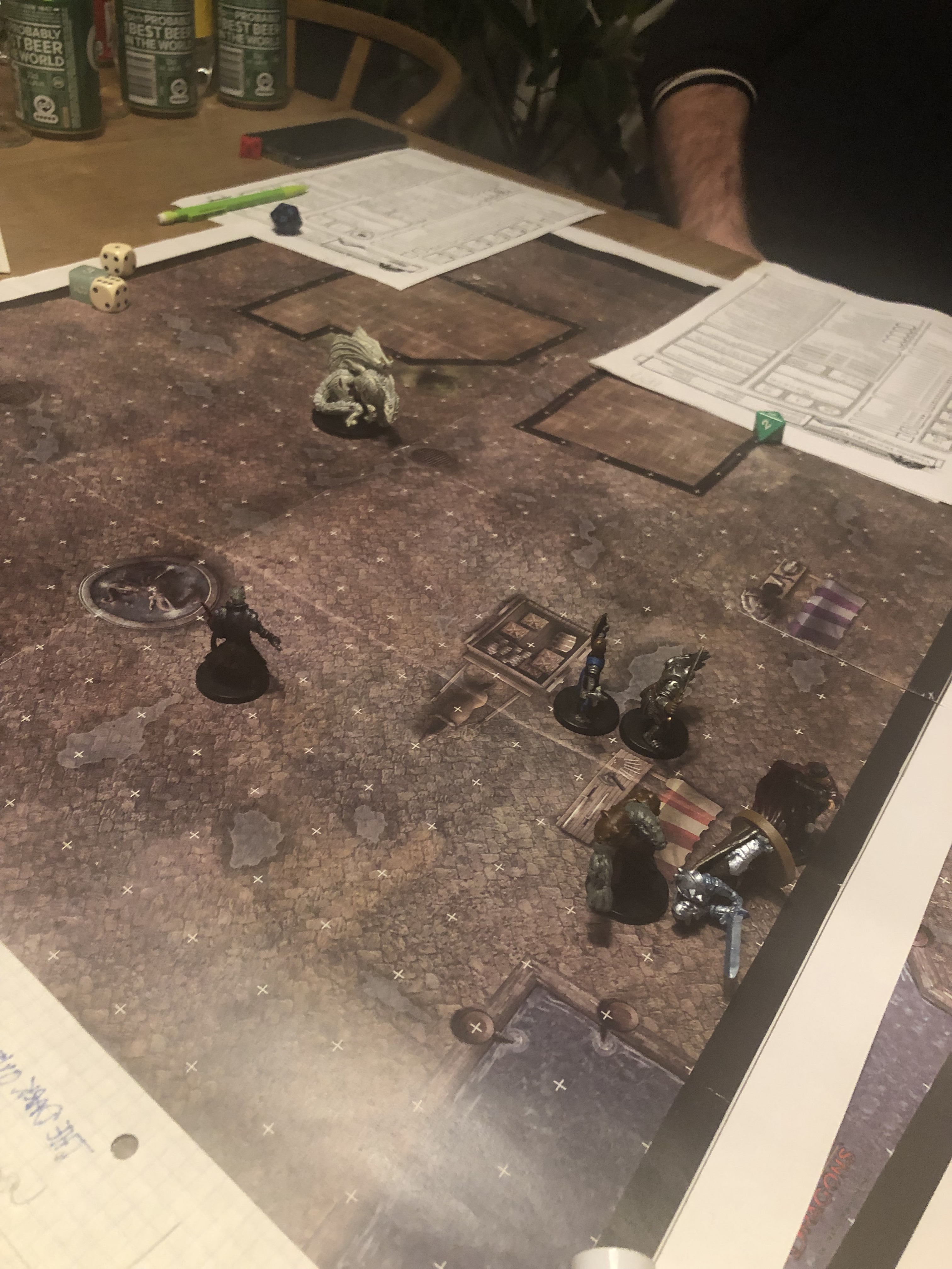 Tom forsøger at sælge et medlemskab eller to, men vi får alle talt udenom (alle ruller 15 og over i diplomacy) og vi får givet ham en ekstra øl og et par terninger i hånden, så vi kan komme igang med at rulle 5E og redde Neverwinter!
