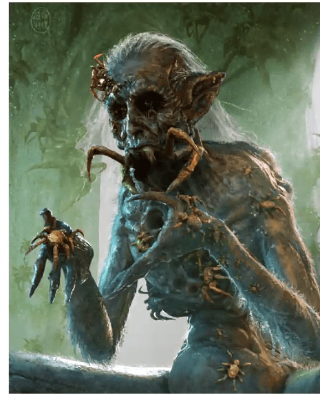 Halv-orken Fitz lister sig lidt i et rum alene og får et chok, der en stemme pludselig taler til ham. Han kalder straks på os andre. Vi står overfor hvad vi tror er en form for Spider Fey. Gamle legender taler om formskiftere og vi antager at denne edderkoppeform måske kan knyttes sammen med tilbedelse af underverdens gudine, der har form af en edderkop.