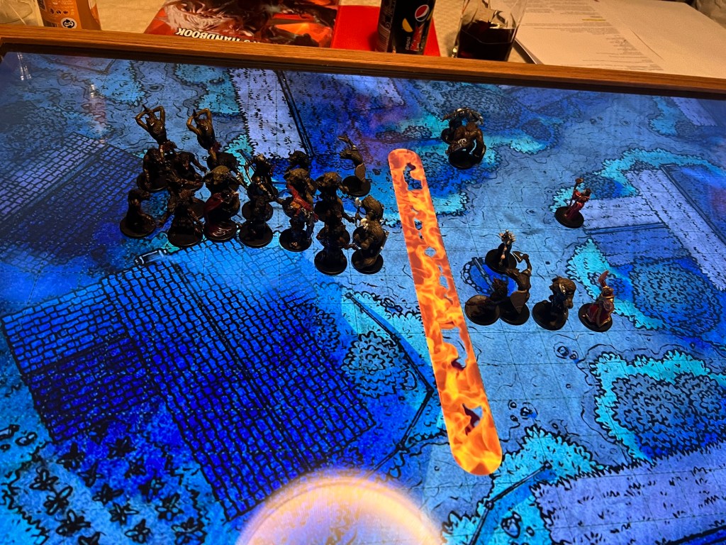 Vi er usynlige og klar til at angribe. Fitz bruger en af hans Javelins of Lightning og rammer fire af ulvene. Fitz følger straks op og kaster tre yderligere javelins og får to ulve ned. Randal følger op med en 4th-level Fireball, og D’agger skyder med sin bue fra det nærmeste hustag. Haz lykkes med at ramme gruppen af varulve med ‘vores’ Staff of Cold. Tre af dem går ned. Vi kæmper med de sidste og ender med at flygte fra den allersidste varulv, der råber efter os, ‘I kommer aldrig til at redde dem…’